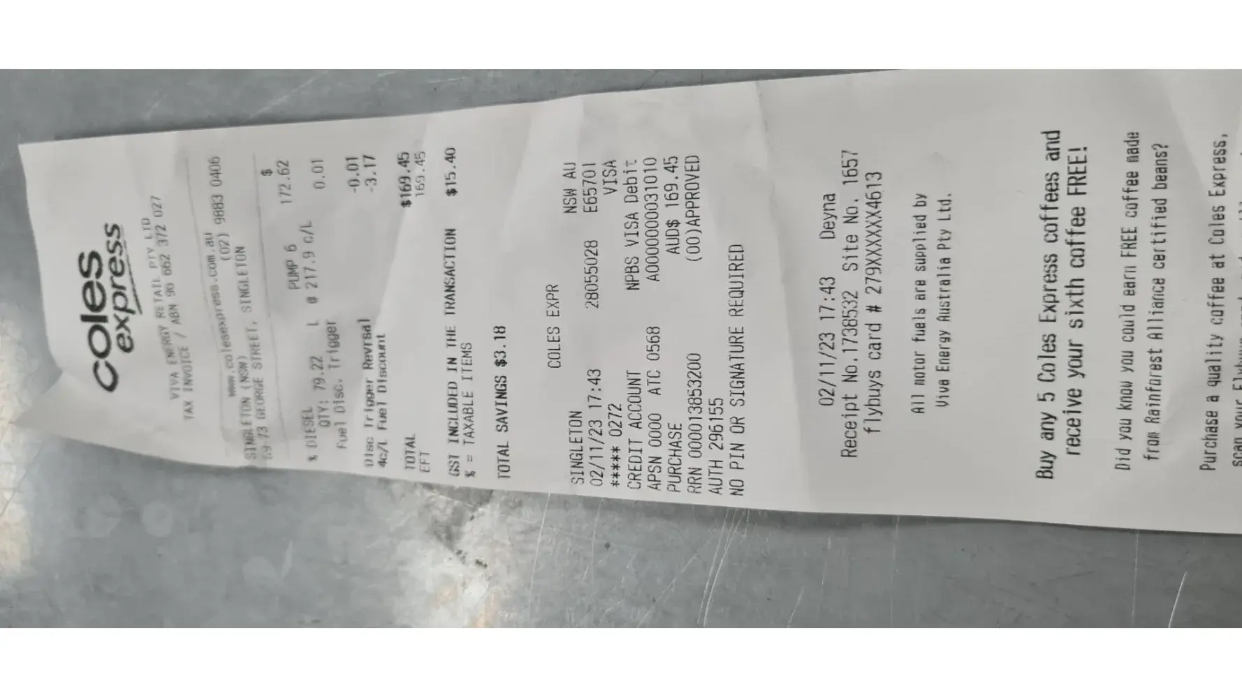 Yesterday 2/11/23 I received an email from Coles Express saying they were doing a promo of * cents fuel discount with valid shopper docket so I went & bought fuel at Singleton NSW but only got 4 cent discount, i was also unable to use my Gday fuel members discount, very disappointed with Coles Express