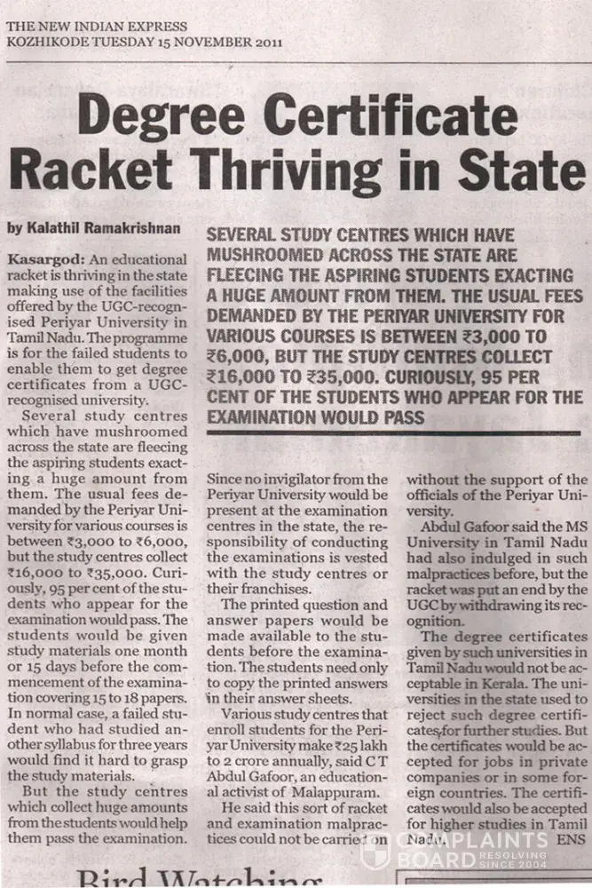 on 15/11/2011 Degree certificate racket thriving in Kerala KASARGOD: An educational racket is thriving in the state making use of the facilities offered by the UGC-recognised Periyar University in Tamil Nadu.� The programme is for the failed students to enable them to get degree certificates from a UGC-recognised university. Several study centres which...