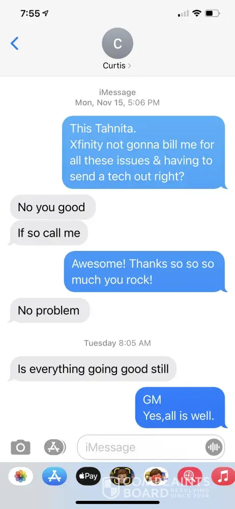 22Nov Received my Xfinity e-Bill with an increase in my bill so, I texted the technician to advise him that my I was charged for the service call.