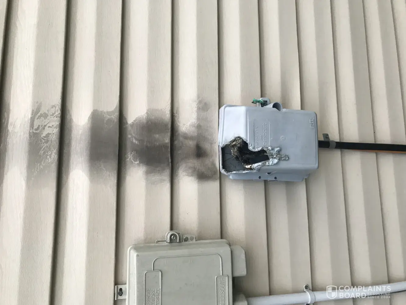 Thursday morning 6/27/2019 a fire started at the Comcast cable box on the side of our house. Luckily I was there to put it out before it engulfed the paneling on the house. I called 911, fire department arrived and checked everything out. They said it was a Comcast issue. Our house and two others did not have power which means my 75y/o mother has no a/c...