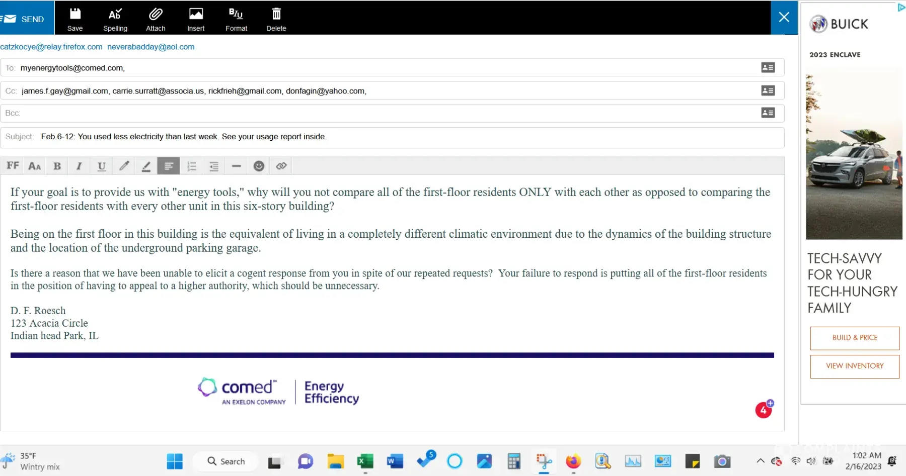 I have asked repeatedly "Can you compare only the first floor units (all units with the prefix"1") to all of the other first floor units only and, if it is not possible, would you please tell us why it is not possible?" If the first floor residents have this information we can compare our bills and the steps that some of us have taken to conserve energy and thereby conserve a greater amount of energy by lessening the requirement.