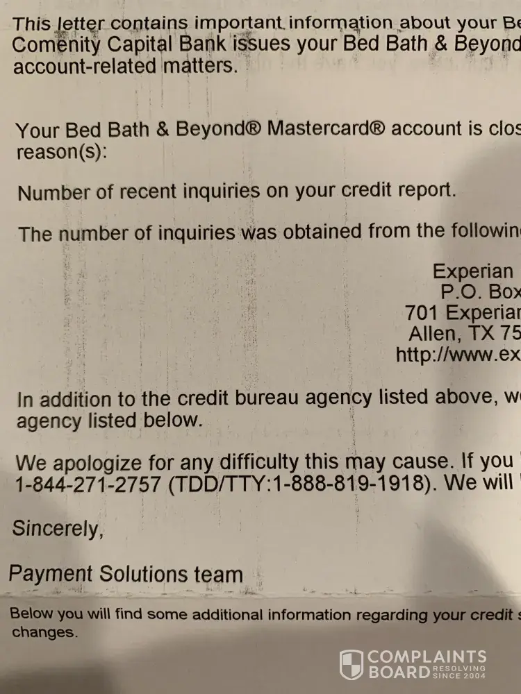 This Comenity capital bank hurts people's credit. I often shop Bed Bath and Beyond. About a month ago I see signage plastered all over about their credit card. I sign up. I get approved on the spot. But I can't utilize my credit in store yet, like Kohls or target credit approvals on spot. They tell me my card will be in the mail. I receive the card with all the info. Two weeks later they shut my card off (hadn't used it yet) because of too many inquiries... there were THREE..one of which was theirs! Now I have a short termed opened credit account that's been closed by the bank on my credit history and it made my credit score take a nose dive!