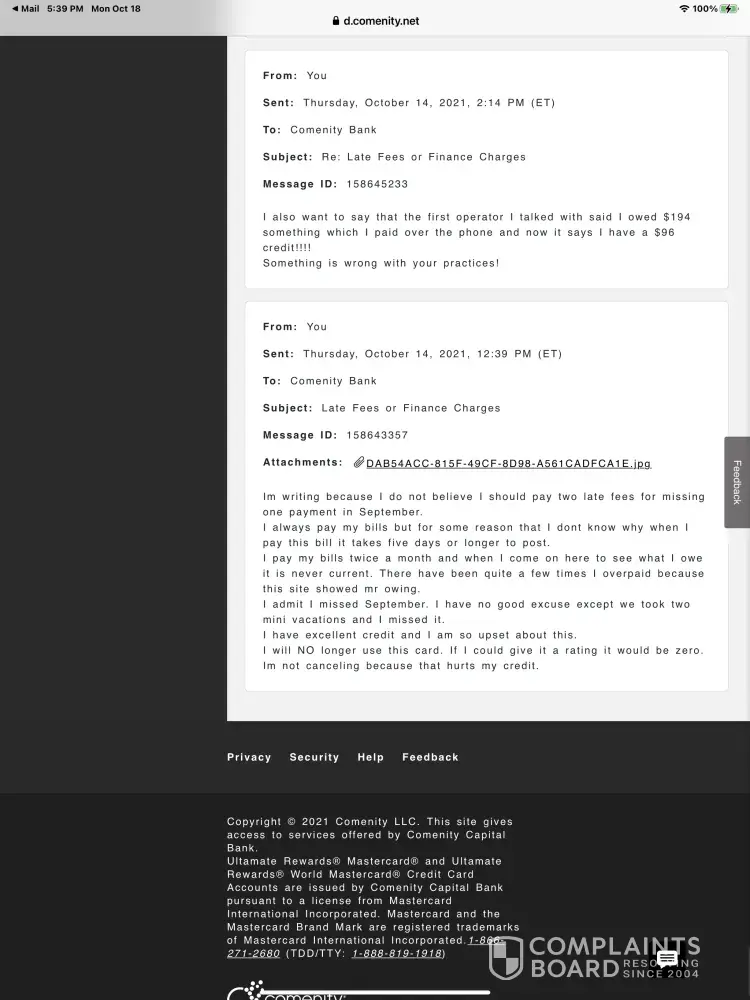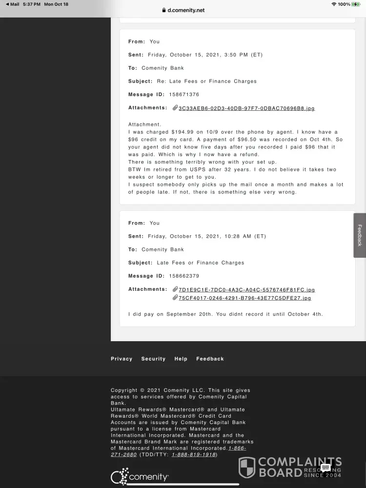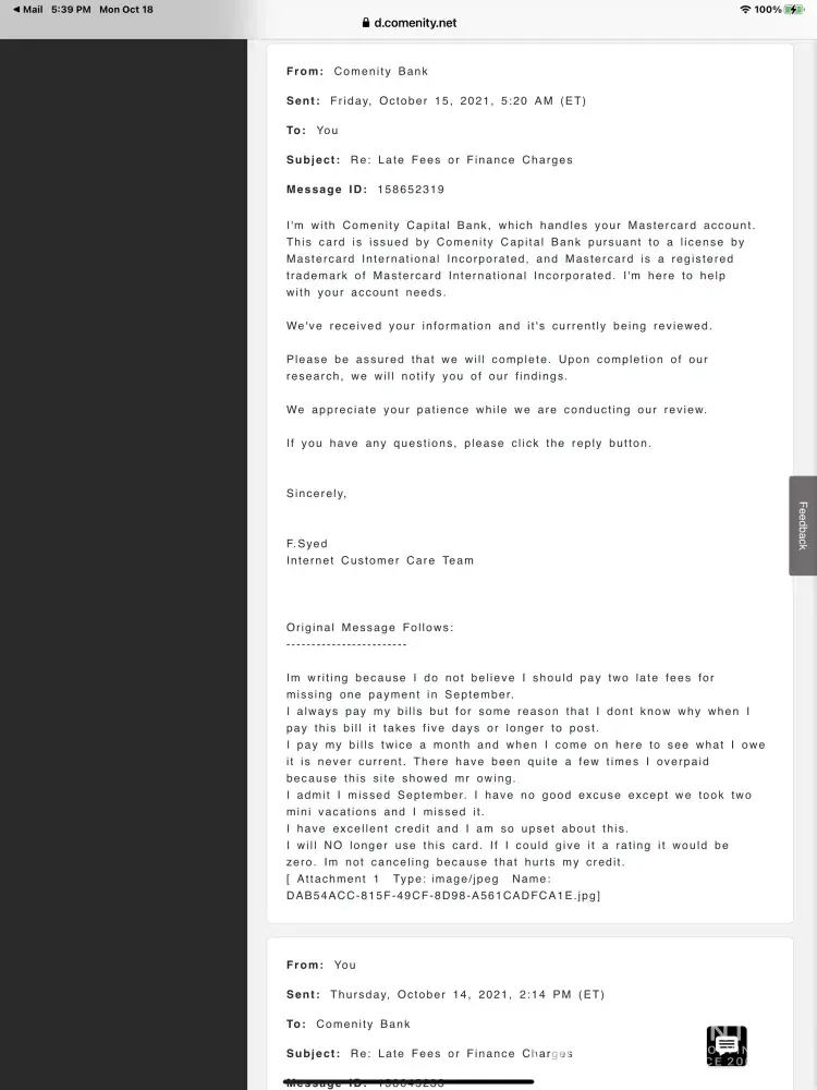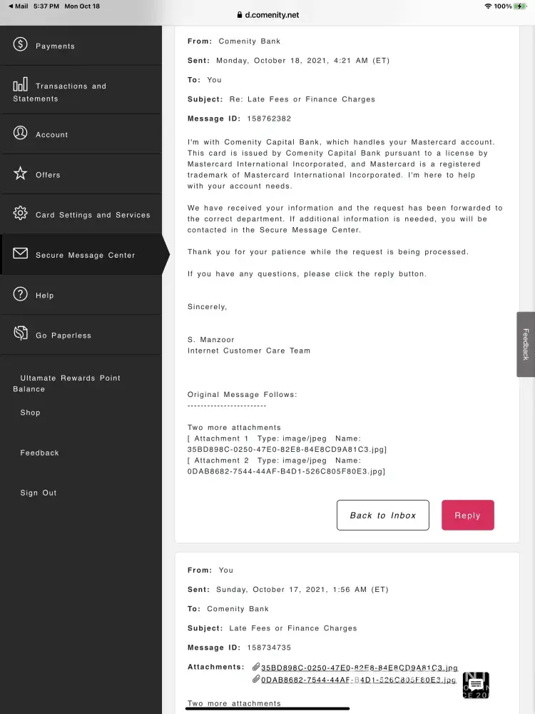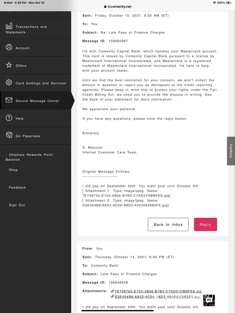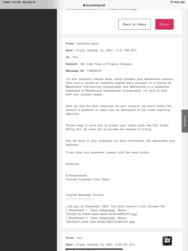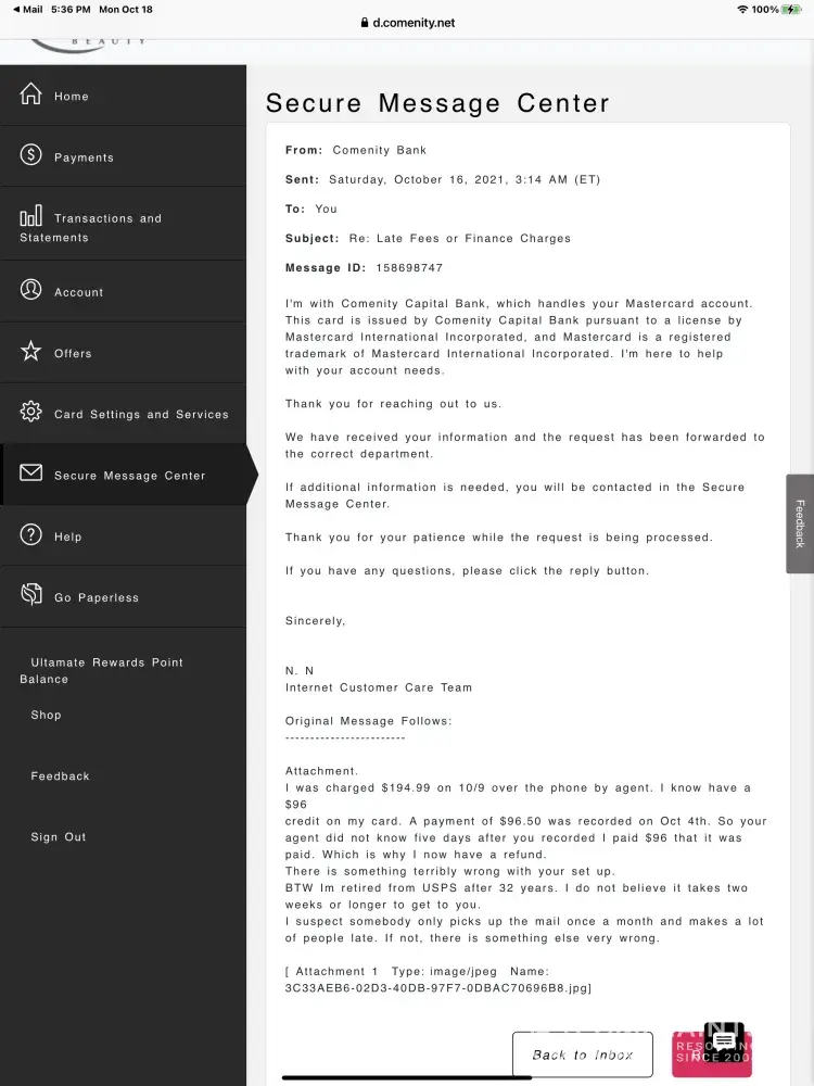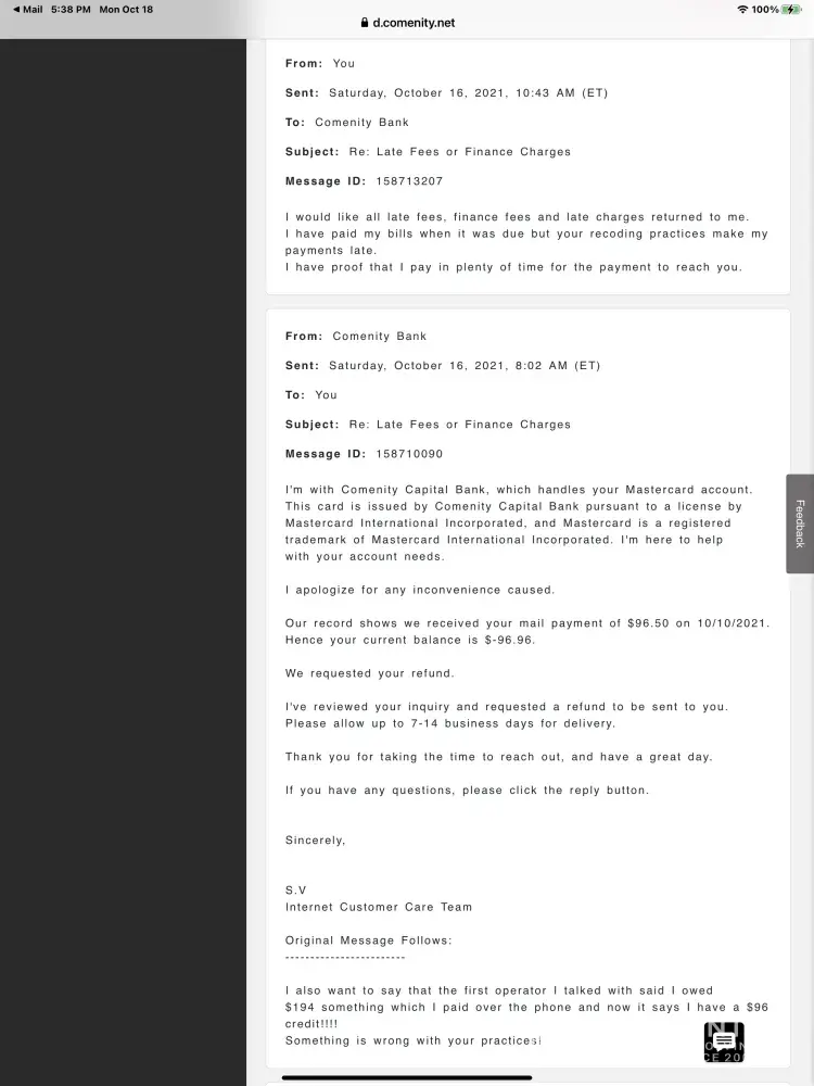 Comenity Bank Master card is the worst credit card and horrible customer service. in my opinion. This bank only is concerned about making money and they do not care about the customer and they told me that by there actions . My financial history with the bank aggravated the bank because the bank could not charge me any late fees with is how they make their money off the customers. I held the card for over 3 years and was never late or held a balance. I send a payment in this past month Oct/2021 . The payment was mailed back to me and then the bank charged me a large late fee. I called Comenity Bank and I was told that the office I mailed the check to was closed due to flooding. I spoke to the bank manager manager Justin #708691 (if he really was a manager ), and he also agreed that have to pay the late fee and he was only interested in the rules and did not want to hear the reason for the mishap. I told him I mailed another check to them he ignored me .The bank agents were very rude and their was no room for any negotiations. Today I called and found out due to all the checks I sent in that I had a credit on my master card for $1, 257.70 due to their incompetence .