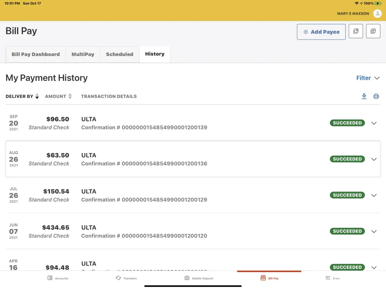 I tried to pay off 3 high purchases early on 4/4 $6777.72, 4/6 $8716.24 & 4/11 $7097.23, but instead of using the acct I have been paying out of for over 10yrs on time every month, comenity used another acct that did not exist. there was an error made somewhere, after seeing my checking acct still had over $30,000, I called to find out why and was told the acct was nonexistent? out of 3 large payments, 2 were returned, If I had known I would have taken care of it right away instead I got penalized for a mistake and harassed and was told I could not use the card for 3 months. finally got it corrected. I had to transfer 5 direct payments to American express so they would get paid. I tried to use my card on 5/8/22 for reading glasses. The card would not work, paying $244.00 for this mistake is not enough penatally, my card is out of service for 3 months? I have an excellent credit score 807, I'm a 100% USMC VIET NAM VETERAN with a wife going into 21 yrs terminal metastatic breast to bone cancer. It's not an excuse It's a fact. Being a loyal customer since joining and paying my payments in full every month, means nothing to BJ'S.