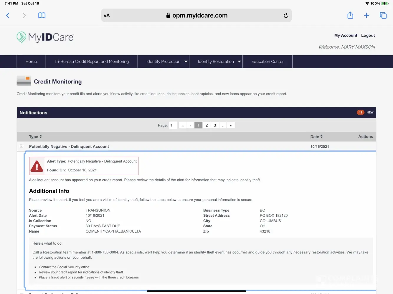 Desired outcome: Credit score fixed and all late charges, late fees and finance fees returned.