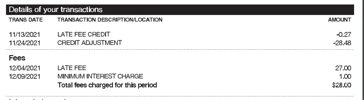 Desired outcome: credit my card for the late fee/interesst of 28.27