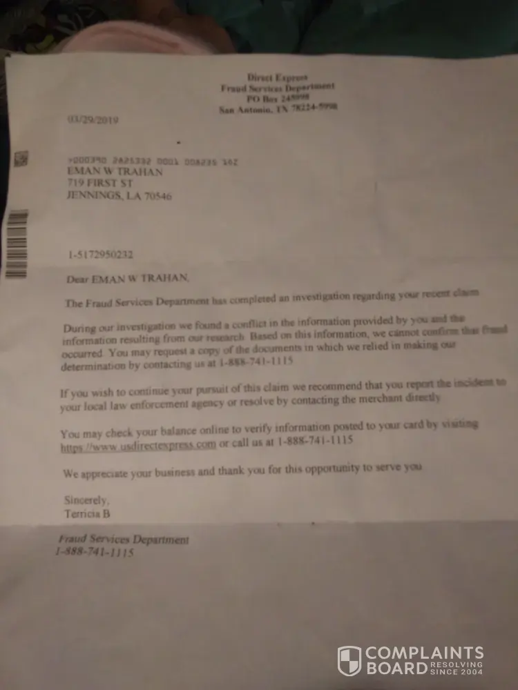 Yes my name Eman Trahan. I recently had my direct express debit card stolen. I filed a police report. I turned that in to direct express. They told u had to go through a couple more steps to complete for processing. Well after this taking months I received a letter from direct express stating a conflict in information provided. The only conflict here is I thought my money was backed by banking insurance. Yes I'm pretty sure it is. So I would appreciate my money being placed back on my direct express card immediately please. Because that's what banking insurance is for. My email is