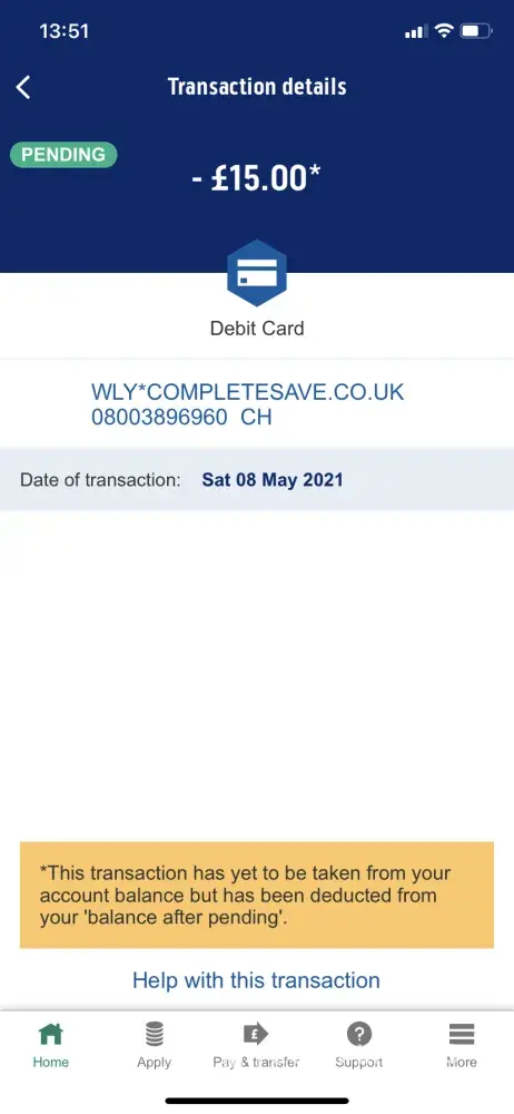 I have woke up this morning only to notice that I have been charged with a pending payment of £15 for ‘wly.completesave.co.uk' which is a company/ website that isn't familiar.