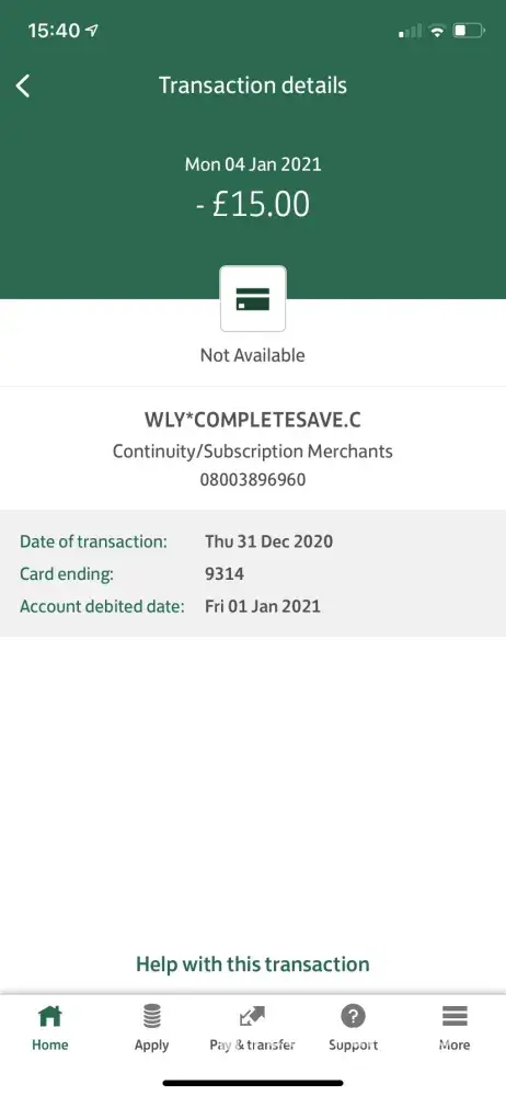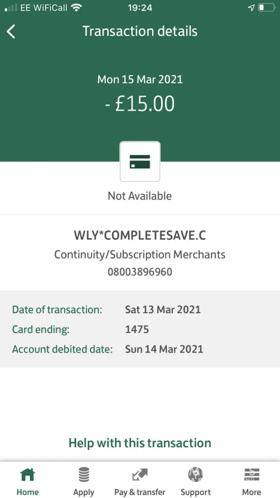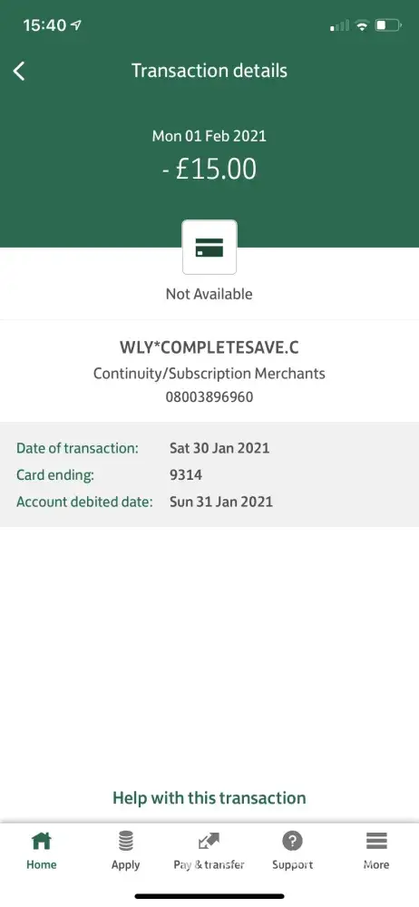 I have never bought anything, or set up any accounts/free trials etc from this, this is the first I have ever heard of WLY*completesave, so I am just wondering why there has been money taken from my account by you. It has me worrying I have been scammed/hacked. I can't imagine how you would have received my details as I have never shared them with you.