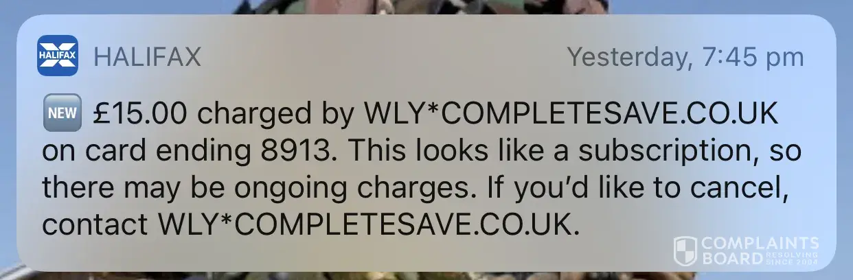 I have just had £15 taken out of my bank account by "Wly Complete Save.co.uk"but as I have never heard of this, let alone signed up for any subscriptions with this company.