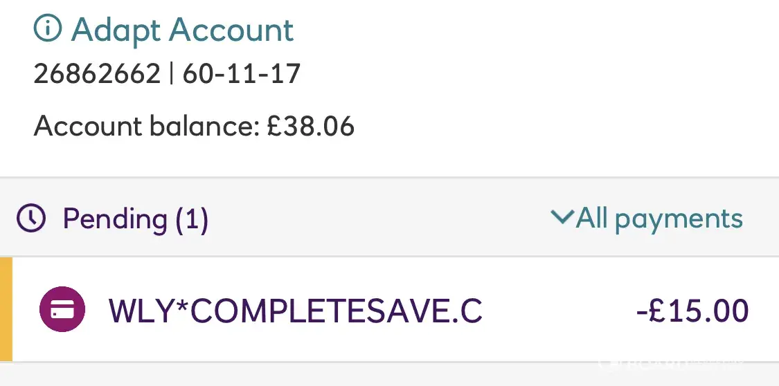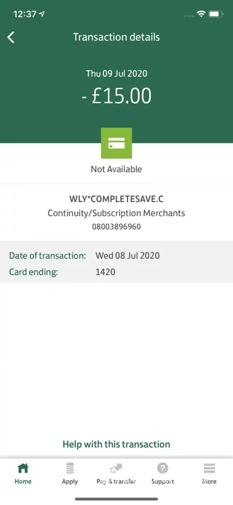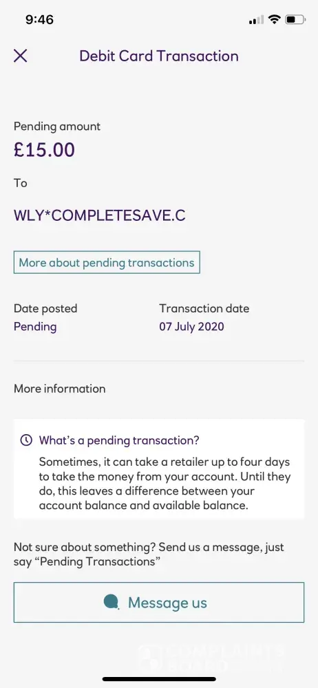 I have just received an unauthorised pending transaction of £15.00 gbp to my bank account from wly*completesave. C but I do not recall ever registering with this company or their services nor have I ever heard of this company?
