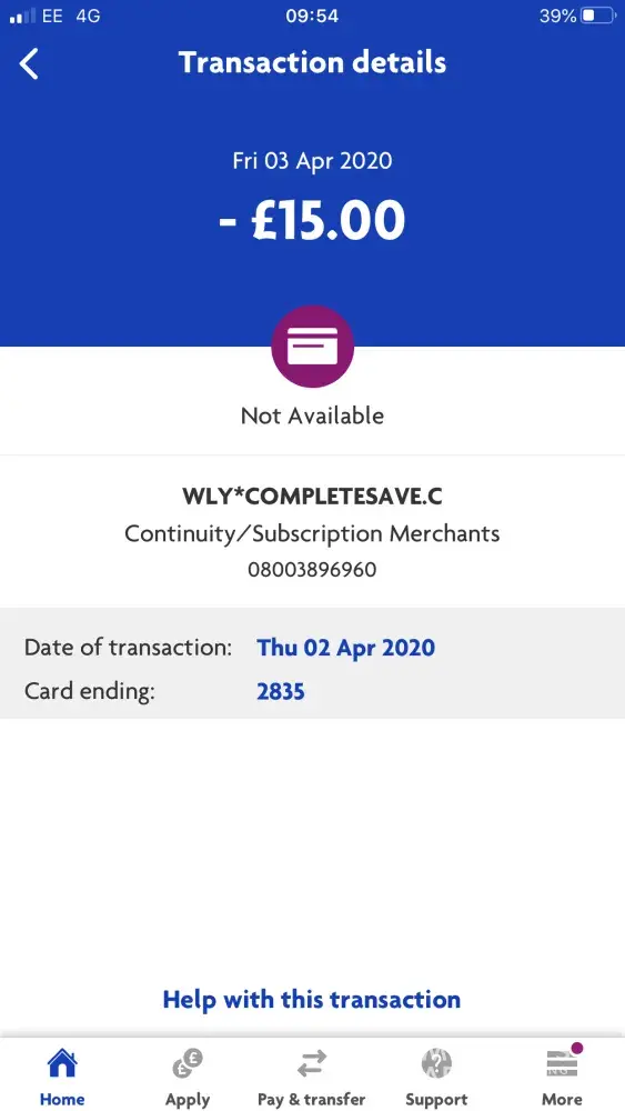 I just so happened to just look into my online bank account and saw that I had £15 taken out of my bank, baring in mind we are on lock down right now and i've been saving my money for weeks and haven't done any online shopping or nothing, to see that the person who's been taking £15 out of my bank was wly*completesave which I started panicking thinking hold on I haven't purchased anything. Went into my apple id to see if I was paying for any subscriptions from them, nope. So I type the wly*completesave into my google and this website comes up. I have a little read on what some other people have wrote to find out this has happened to many other people. All the people who have complained about this the people who own the website have told them that they have signed up for something! I can tell you right now I hardly ever buy anything online and the last thing I brought online was in October 2019 it's now April 2020! There was an email attached to the website owners comment so i've decided to email my query and to find out why am I getting £15 taken out of my bank when I haven't signed up for nothing!