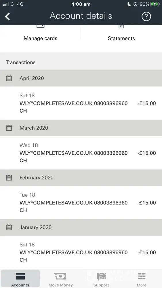 WLY*CompleteSave.co.uk — unauthorized charges of £15 to bank account monthly
