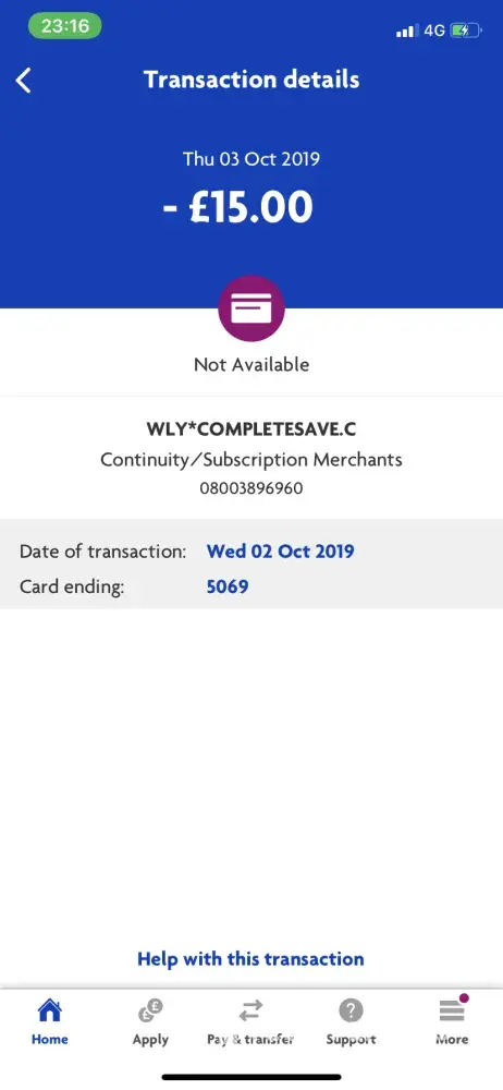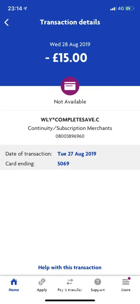 I do not recall signing up to complete savings and for 13 months £15 has been getting taken from my bank. This is nearly £200 and I am a student and was not aware of this nor can I afford it. I have never used any of the complete savings services nor have I saved any money through these services. I contacted my bank (Lloyd's bank) and they told me I should be able to get a full refund through.