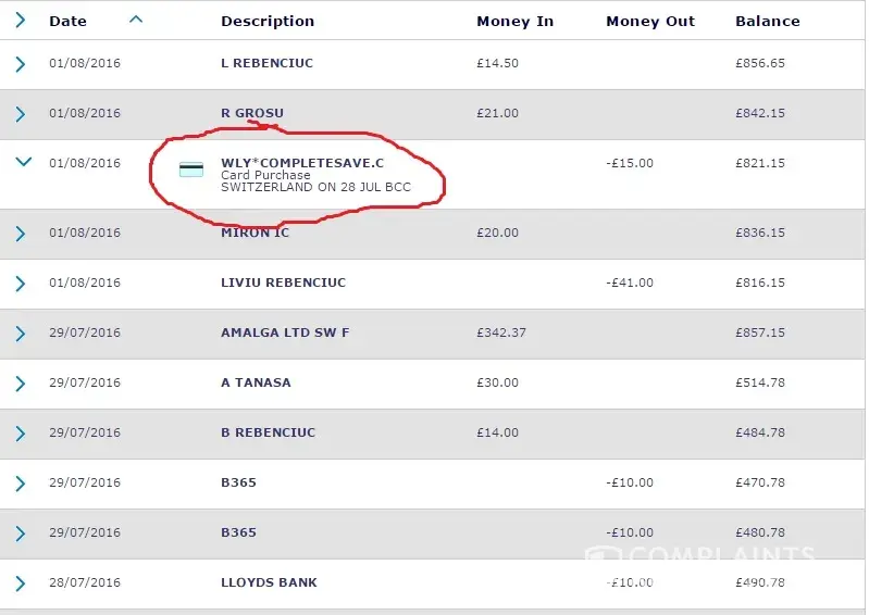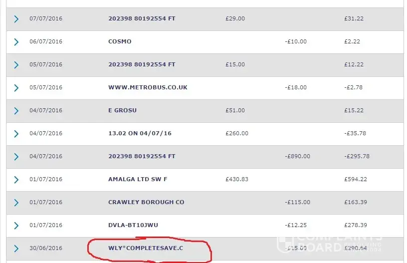 I know I am not alone in making a complaint about Complete Save. When I noticed £15 debited from my account, and had been for 4 months, by a company I was unfamiliar with I checked them out. The credited account appeared as WLY*CompleteSave.co.uk in my statement.
