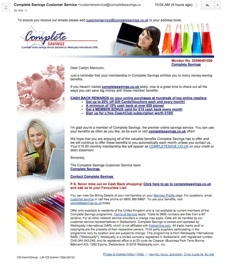 What bothers me is how Complete Savings got my credit card info in the first place.