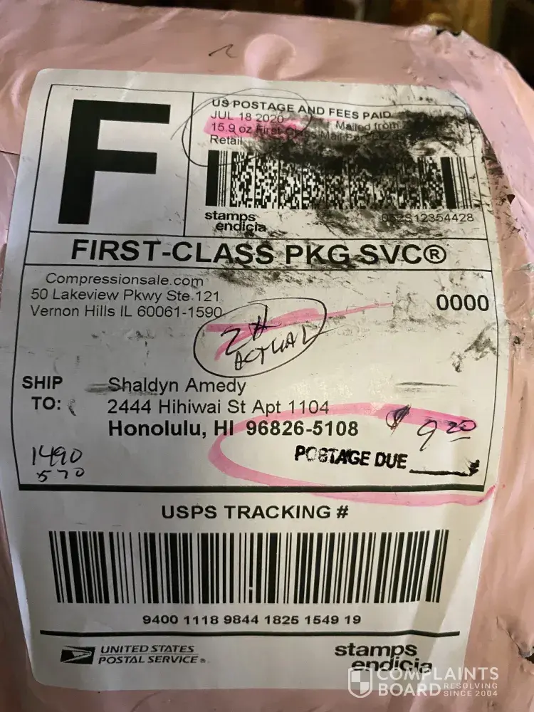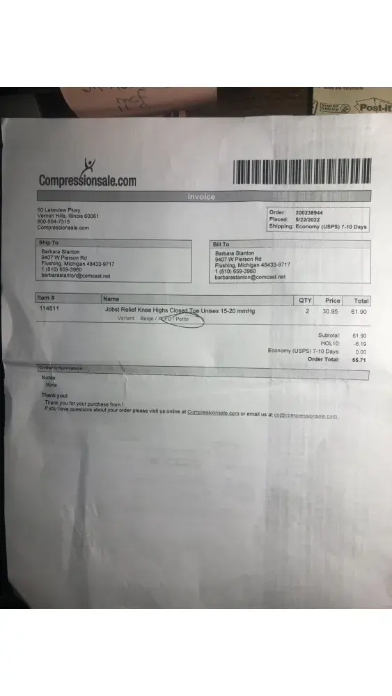 August 17 I received the my shipment bag and invoice from Compression sale which was empty. The bag had been slit open and the 2 pair of Jobst's knee high socks had been removed. Why the postman delivered the the empty, damaged bag remains a mystery. I called Compression sale support and was told they could do nothing but would send me form to file a complaint with the post office. I'm still waiting ton the form. Buying direct from Compression sale is not reliable. Amazon just got a new customer, Chet