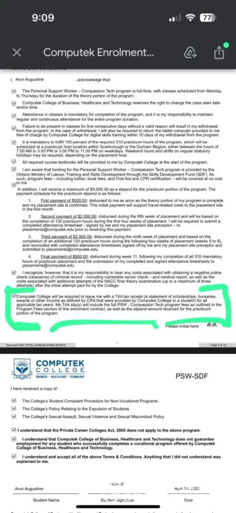 As first they made a contract sign from all of us mentioned that it’s a free course and they will provide 5000$ for each of us after completing the program. We are not even finishing the program, we received the T4 of 13255$ which we didn’t get from the school. We only received 4500$ and they send us a T4 with 13255$ amount. They are fraud all of us saying different things and coming up with the new things. Please solve my situation as soon as possible!
