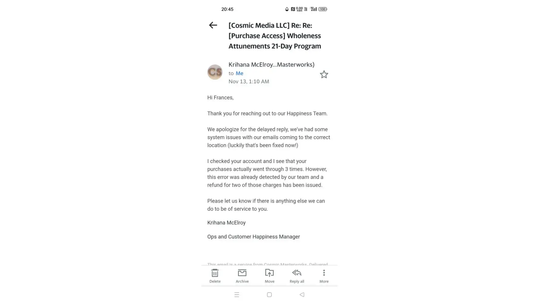 Overpaid Spontaneous Transformation Program. Paid 2*US$111 direct to McLean Masterworks and 1 payment US$111 through PayPal on October 25, 2023 due to computer glitch. Have written emails asking for refund of US$222. No response until I sent to Complaints Board for assistance. Received reply November 13 acknowledging receiving 3 payments and refunds have been issued. Have not received refunds till today November 15. No response.