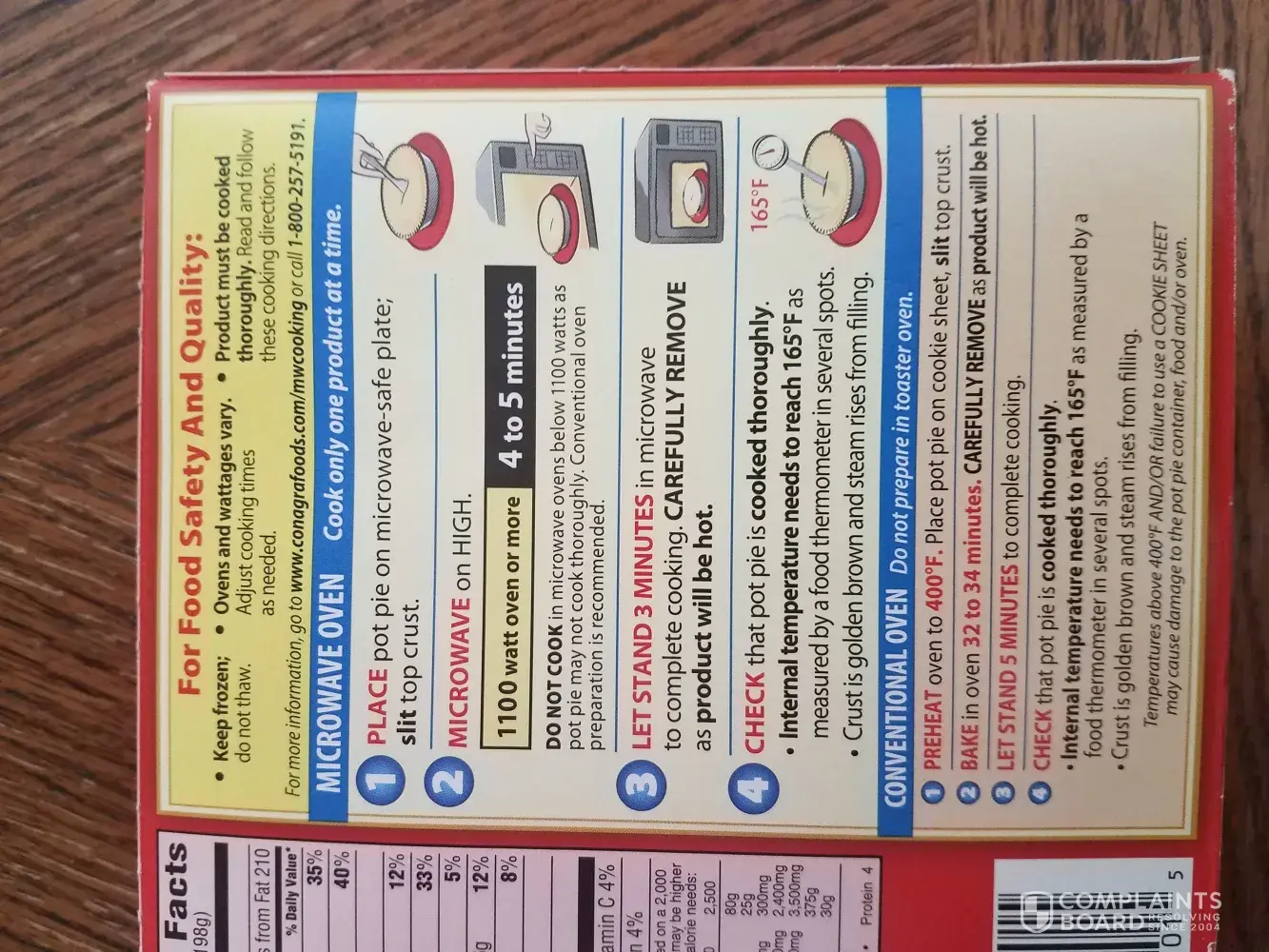 I cooked the chicken pot pie in my microwave as instructed on the instructions. It did not tell me to remove from the pan the pot pie was in. Needless to say I'm having to purchase a new microwave, it melted my Tupperware plate and my house filled up with smoke. I will never purchase your product again. I feel you should be buying me a new microwave. I have pictures attached.