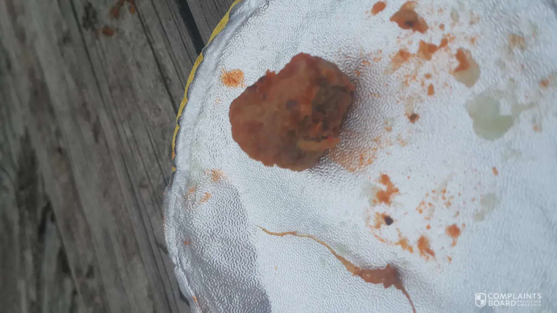 I was feeding my 2 year old Grandson Spaghetti and meatball dinner. That his parents dropped off with him. And when I cut into the 4th meatball to feed it to him there was a stringy worm like thing sticking out...Then I saw more. I stopped feeding him the food... and had to get him something else to eat. There are pictures included...