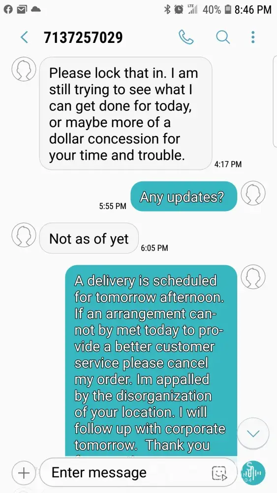 This is unacceptable, from a company like Conn's or a third party delivery service. The delivery guys were poorly equipped for the delivery. As they themselves stated when they arrived and I asked about the U-Haul.