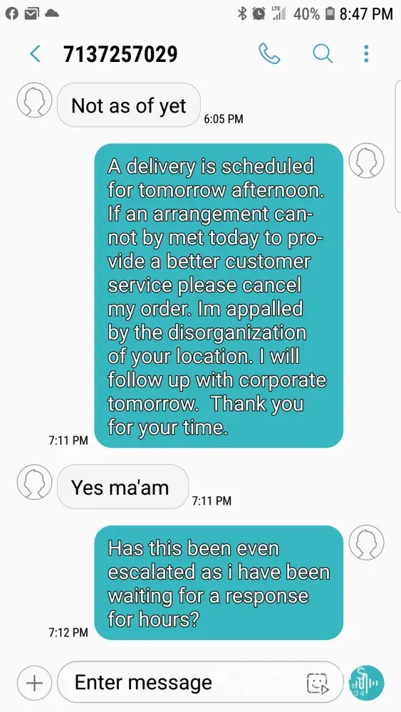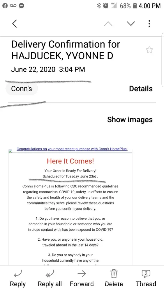 I expect a phone call as soon as possible to get started on resolving these serious issues with Conns Homeplus. Thank you very much four your assistance.