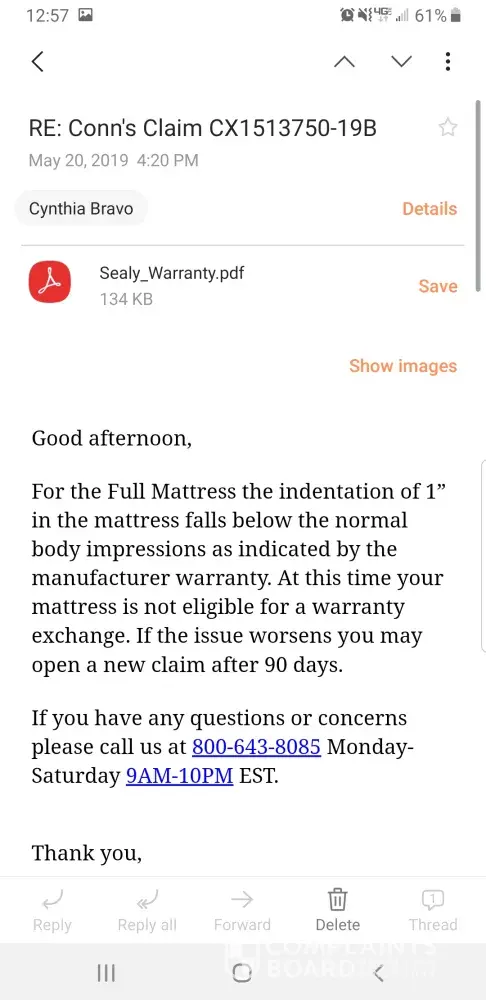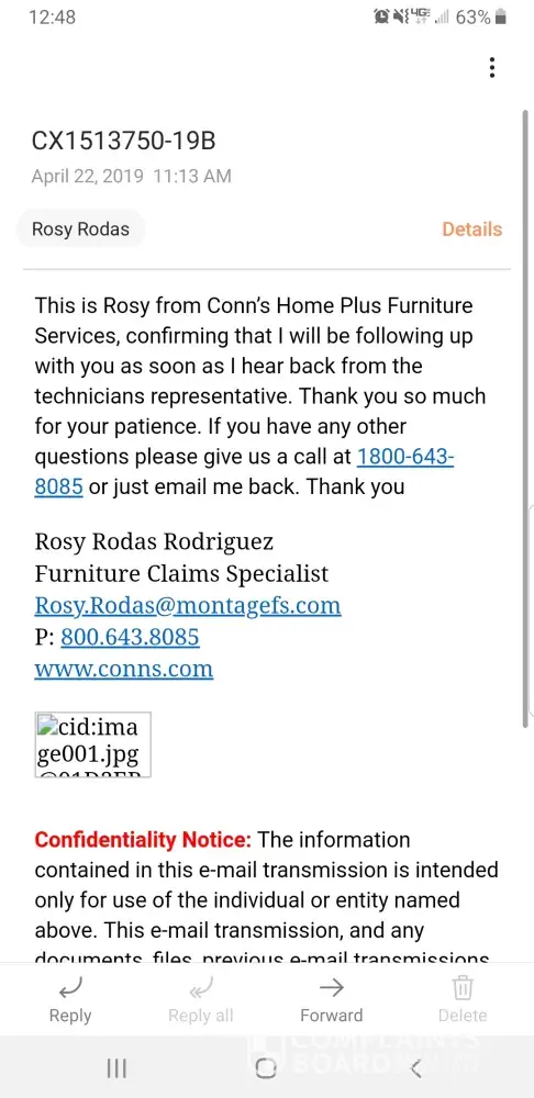 On saturday morning, 4/27, my mom forwarded me an email (attached) that conn's had sent her. I called the number on the email.
