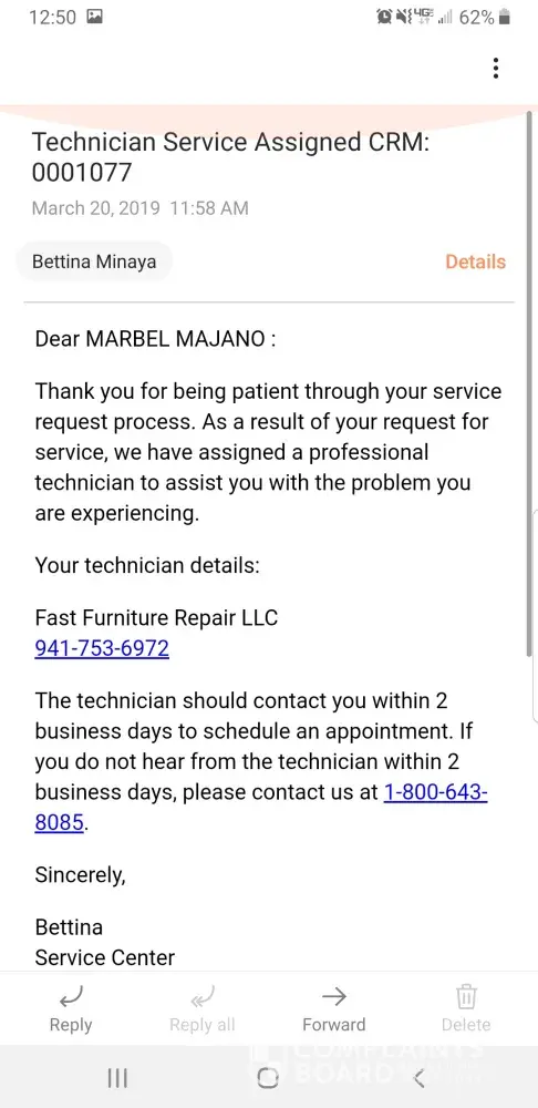 Fast forward to march of 2019, I called the conn's furniture service department in my area. Webster, tx store #266. I was told parts were ordered. Nobody told me these parts would be shipped to my home address and that I would have to call them to set up a repair appointment. 3 days later, I received what appeared to be packaging and foam wrapped in tape from somebody we did not know. My wife tore through the foam looking for something and eventually threw it out. 2 days later, my wife received an email stating the "part" had been delivered or would be delivered soon. Are you kidding me!? Now I get notified!?