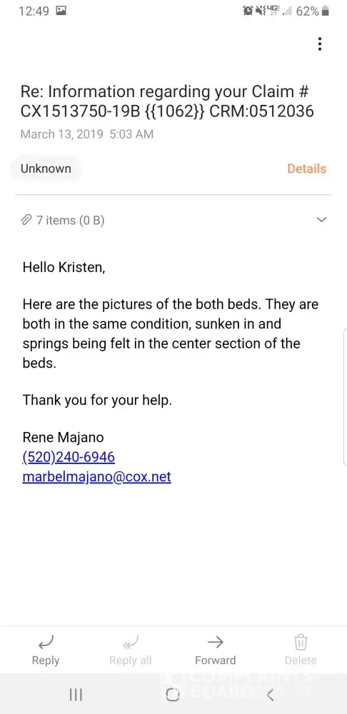 I purchased a furniture sofa set in may of 2018. I filed a claim in december 2018 to repair my couch.in december 2018, they sent out an employee to take measurements. That was the last time I heard from them.