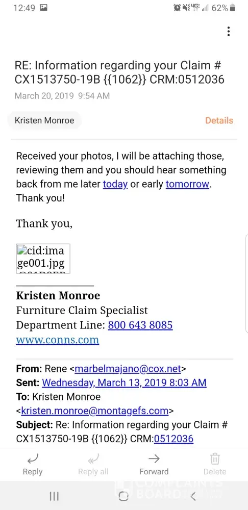 I sent the pictures as requested at the start of the claim on March 13 and I have email confirmation of when the Technician showed up to my house to evaluate. A week or so went by and I called Conn's to find out about any update and I was told that they had not received the Techs report so pretty much if I hadn't called for an update nothing would have been followed up on and there was the first delay.