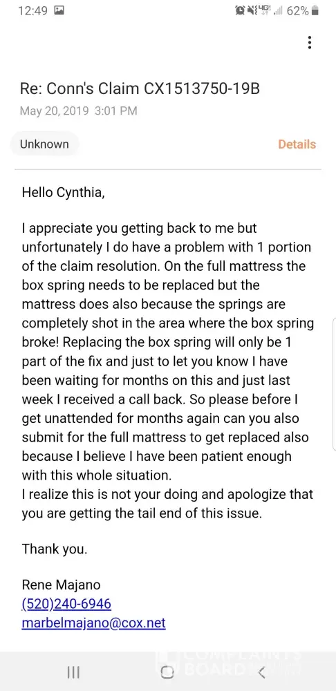 I have a queen and a full mattress that requires replacement because the springs are sunk in on both beds and the spring box on the full bed is broken but the service department supervisor LeAsia Reed makes it seem like I failed to report the problem when in actuality that's what I thought the Technician's job was to do! There have been many emails and phone calls with the customer service, service department and also the 3rd party repair company Fast furniture and no one has been able to correct this problem. Fast furniture just called me to confirm an appointment that was set up for the 28th but they made a mistake and set it up for the 27th even though they acknowledge there mistake if I wouldn't have corrected them they would have shown up and blamed me for not being at home which wouldn't be the first time that's happened. Fast furniture is not doing their job and Conn's service department is doing a worst job in correcting this problem. In all my phone conversations with Conn's Customer service to try to elevate this to someone that would be able to resolve it all they do is apologize for this situation and confirm that it definitely shouldn't take this long but that they are not part of the service department. So now 3 1/2 months later I'm still paying for broken beds that both my children have to sleep on all because Conn's keeps giving me the run around.