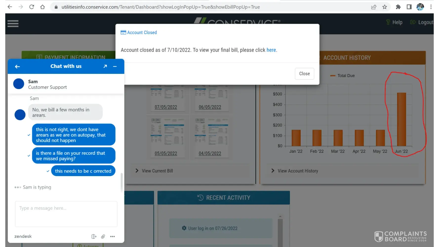 we rented at 1032 W remington Dr #3-04 for around 4.5 years, been on conservice utilities autopay for monthly bill till july 4, 2022, i moved the family out july 1, 2 weeks ahead of our official move out date of july 10, and by july 13 conservice sent me additional $358.96 dollars last bill? Conservice Utilities customer service confirmed we auto-payed religiously our monthly bills but said our last bill contains 2 months arears which doesn't make any sense.