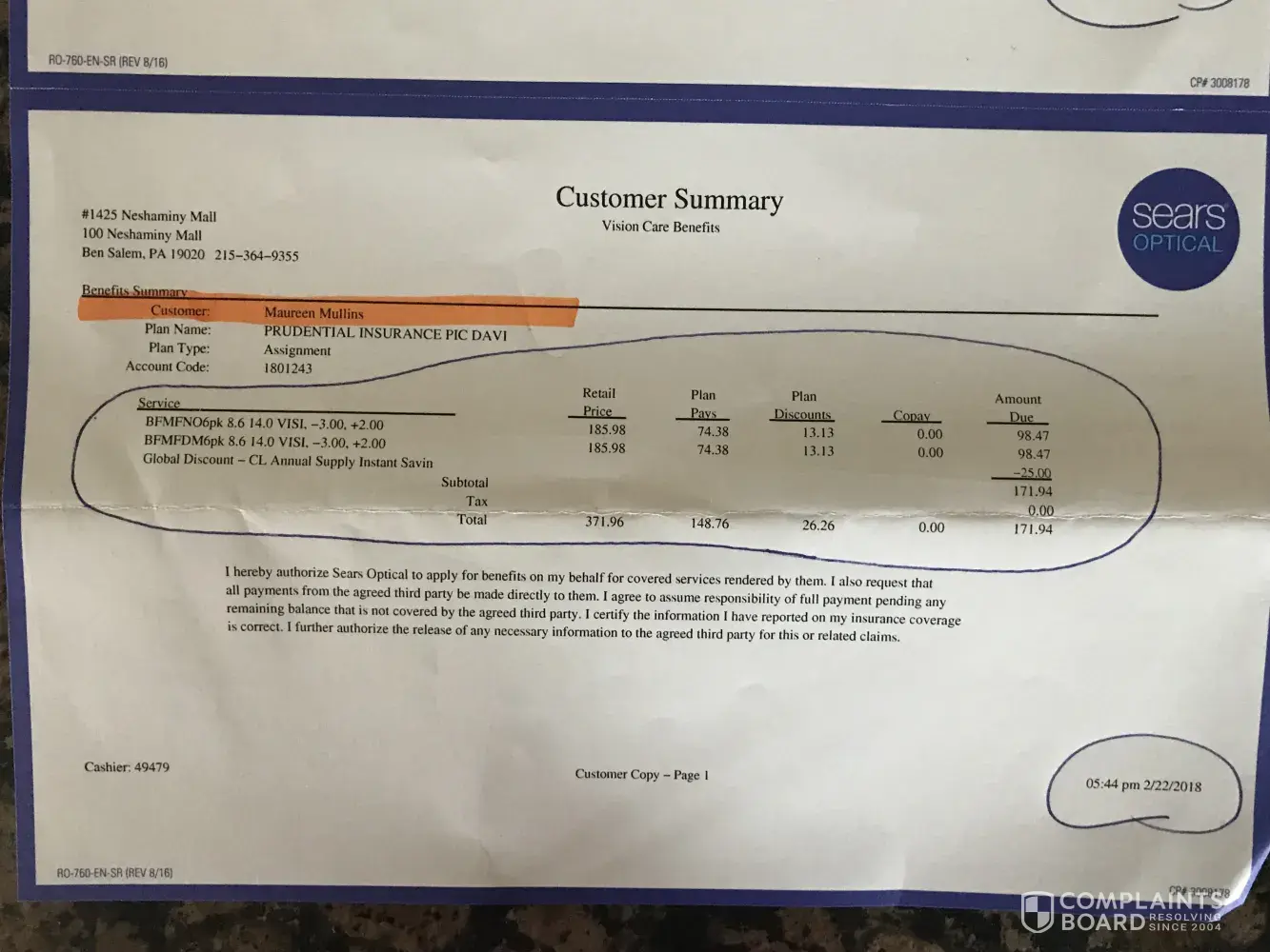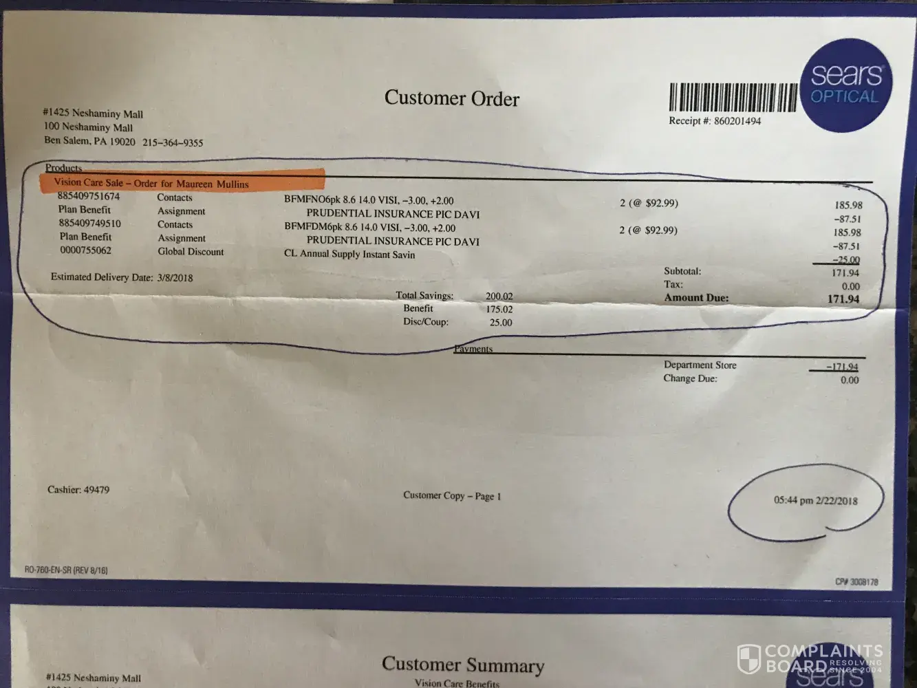 After speaking to Sabrina and Matthew (Supervisor) at [protected], I am further dissatisfied. I expect the rebate form to be honored in its true spirit. My rebate submission was complete according to the rebate form, after I have submitted each "required document" as requested. The register receipts are also showing numerical one after the other, showing that an eye exam was followed by the purchase of the contacts.