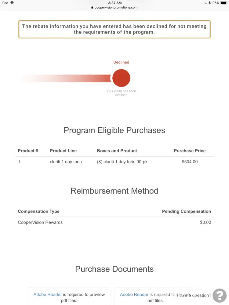 I was convinced to buy their contact lens because the eyewear store told me about this rebate program. It sounded like legit. I submitted all the documents required and after a while, my rebate was simplify showed as " declined" with a generic reason "The rebate information you have entered has been declined for not meeting the requirements of the program"! The rebate is really a bait to get your buy-in, get your money and leave you hang in there like an [censor]. Such a liar and unethical company!