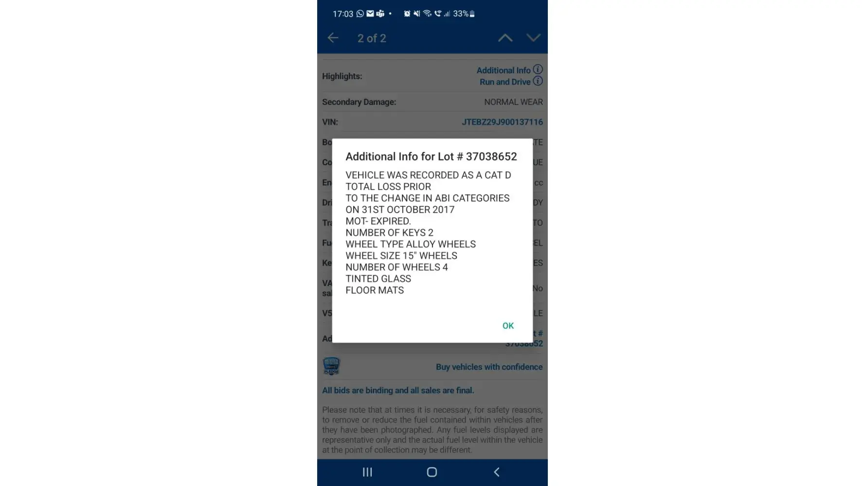 I went to pick the car up from Rochford but that car doesn't drive at all. The vard manager had it jump started but it still doesn't move and had a mechanical fault in it (which was not mentioned in the description).