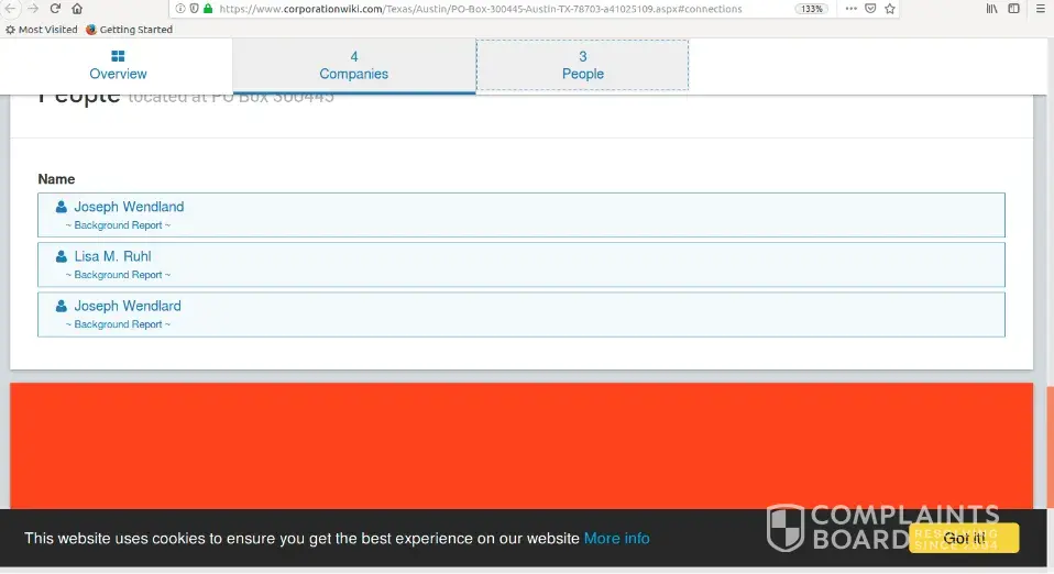 I own the PO Box 300445, Austin Texas, 78703. I noticed that corporationwiki falsely claims that LISA M RUHL has my PO BOX address. That is false. I cannot find a complaint form to get the false info off the internet. So I put my complaint here. I wish they would remove this person from wrong affiliation with my PO BOX.