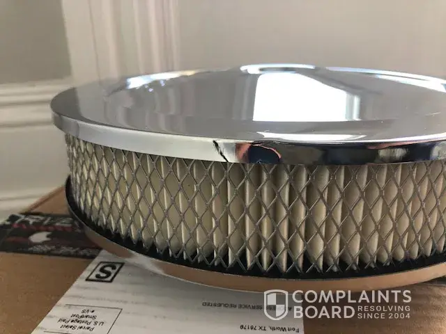 Order #AB- 312842 I bought an air filter for my 1975 corvette. The air filter was dented right out of the box. I took pictures of the filter out of the box as well as on the car. They refuse to replace the lid and it took more than 7 days to ship and 7 days to get a response. please resolve this by emailing me at [protected]@gmail.com