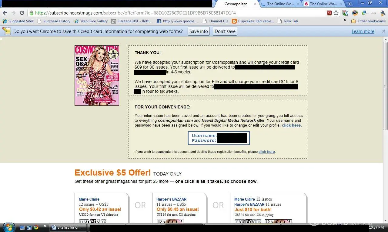 Also I did this deal along with it "Check this box to also receive 6 issues of Elle for just $5 more." and on the receipt it said "We have accepted your subscription for Elle and will charge your credit card $15 for 6 issues. Your first issue will be delivered to ---------------------------------------- in four to six weeks."