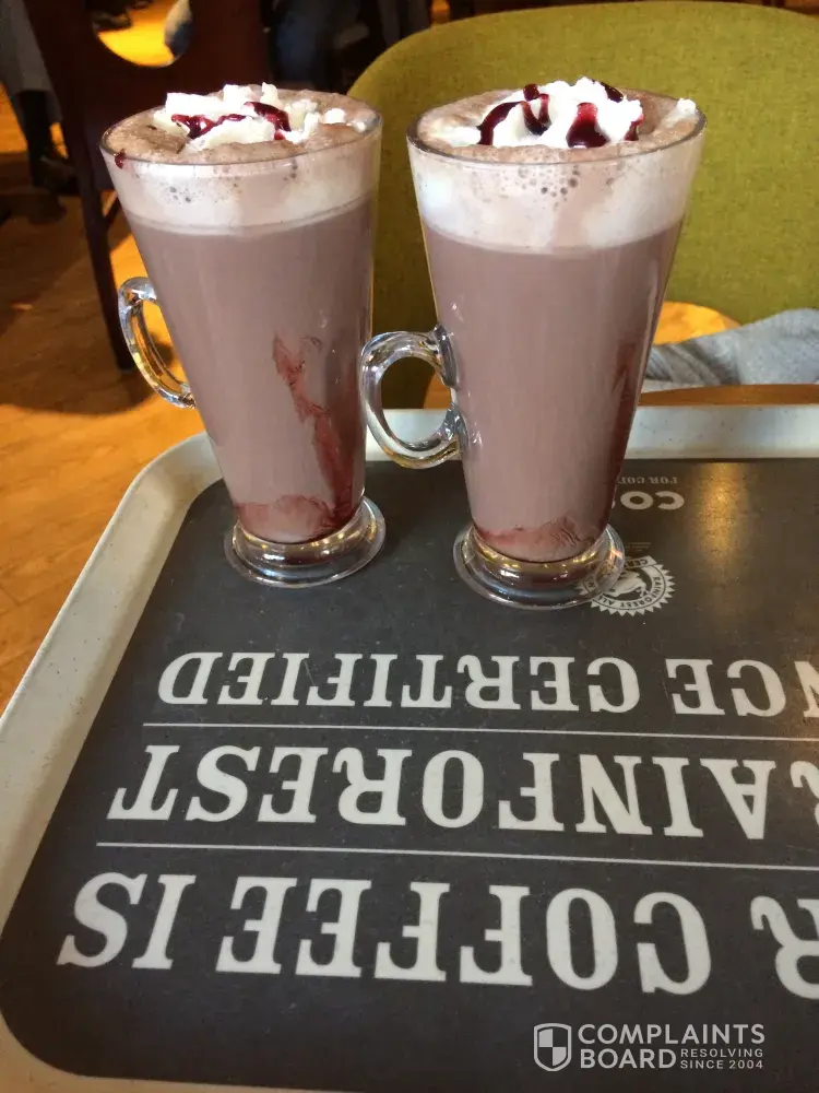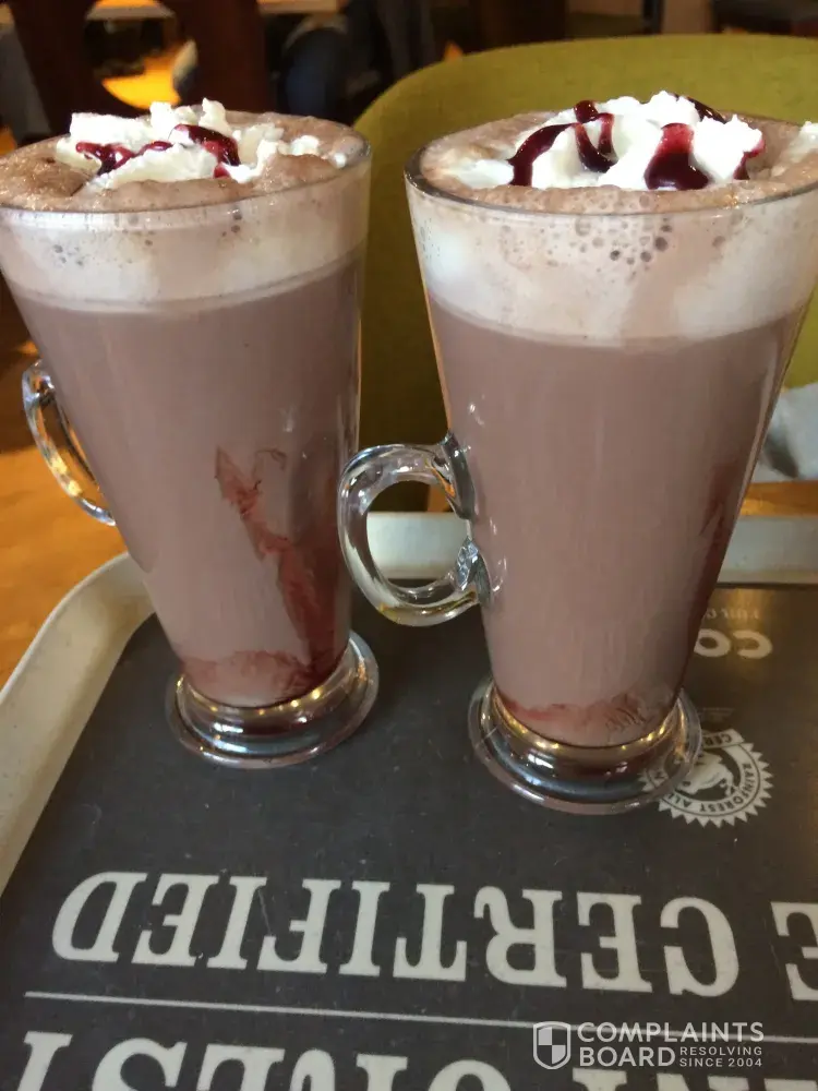 I took the tray with the two drinks I ordered to my partner and we both were disappointed of the results of what we got compared to the expected Black Forest Hot Chocolate we were expecting from the adverts both in the local newspapers and the posters within the Costa coffee store.