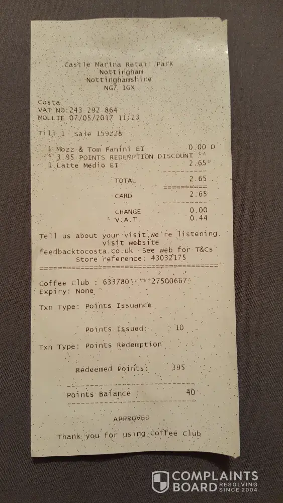 I visited a Costa in Nottingham (Castle Marina Retail Park) on 7th of May. I wanted to redeem my points because I knew I have more than 1000 points but somebody did a mistake during that time because my real redeemed points were 395 but now my points balance is 40. Somebody redeemed more 660 points. I'm very disappointed. How can it happen? It's unbelievable.