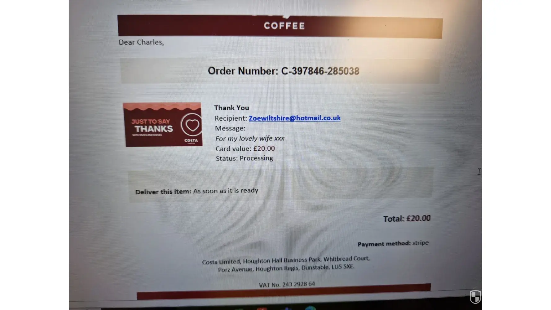 Ordered 4 gift cards on 25th Nov and still waiting for delivery..contacted Costa several times by email to which they have sent an automated response 🤔 but still waiting..shocking service and you cannot talk to anyone on the phone as they now only deal online