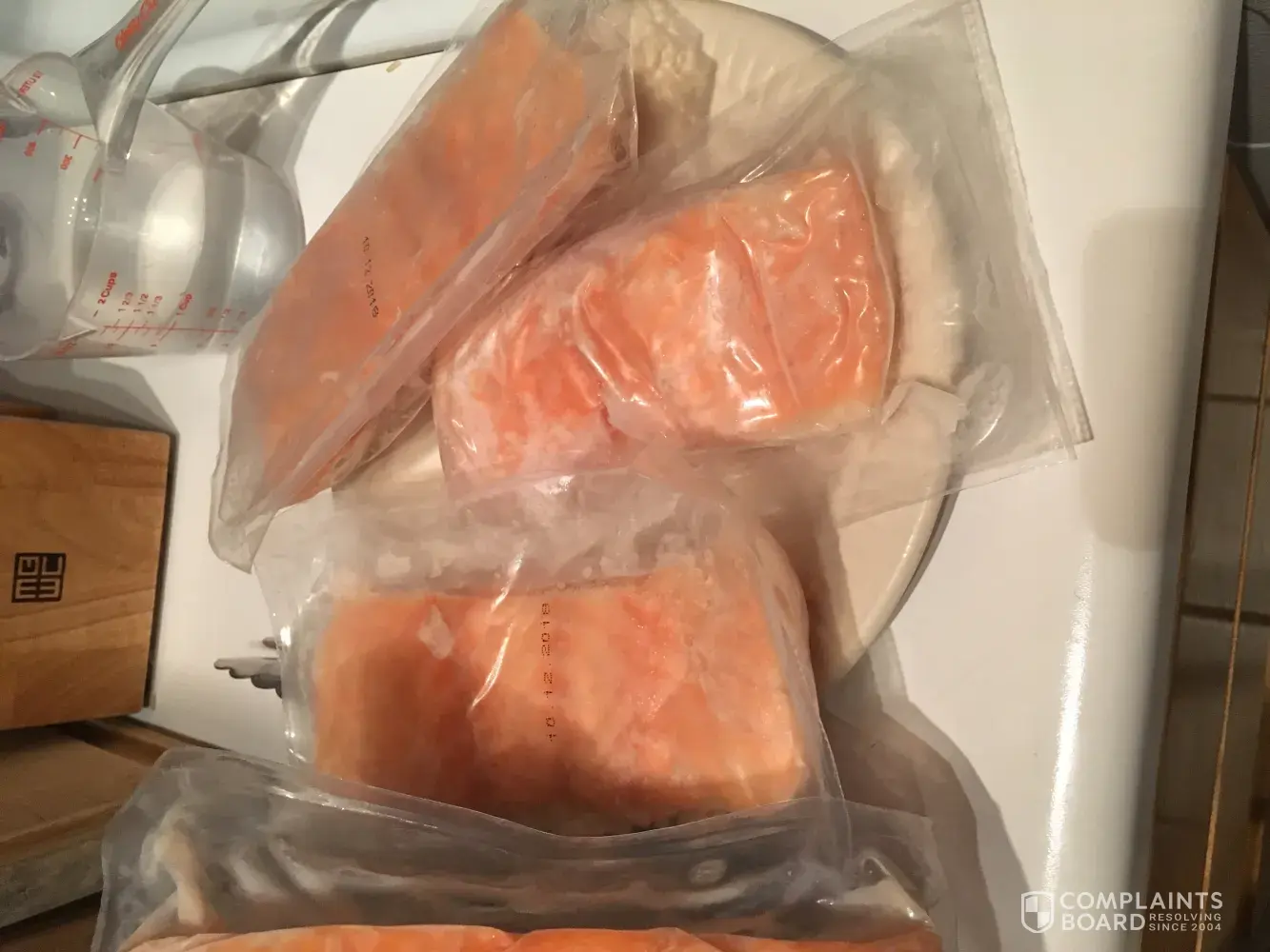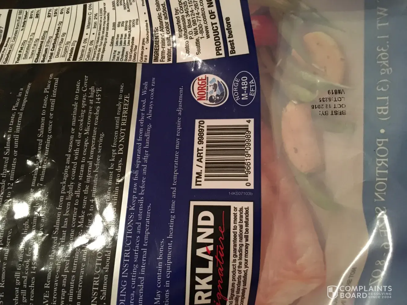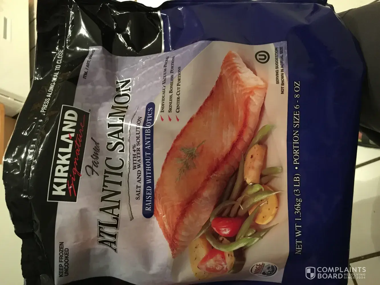 Hi, the 4 past bags of Atlantic Salmon that I’ve purchased from Costco at the Niles, IL location have been defective. Upon opening the bag I’ve found that at least 4 of the 6 individually wrapped Salmon are not sealed air tight, but are instead open and already have freezer burn. I thought the first time was maybe a bad batch, but this has been ongoing with every bag that I have purchased thus far. Beside the freezer burn, the Salmon I was getting ready to cook tonight had a black (rotting looking) substance on/in it and did not smell right at all so I was forced to dispose of it. I’ve always enjoyed the Kirkland brand Salmon because it was great tasting and was more affordable than other brands, but I must say that I can no longer keep purchasing this fish. It’s too expensive to just have to throw into the garbage. I’d like to know if I can get a refund at least for the one bag that I still have. Attached will be some photos of the product and bag. Thank you.