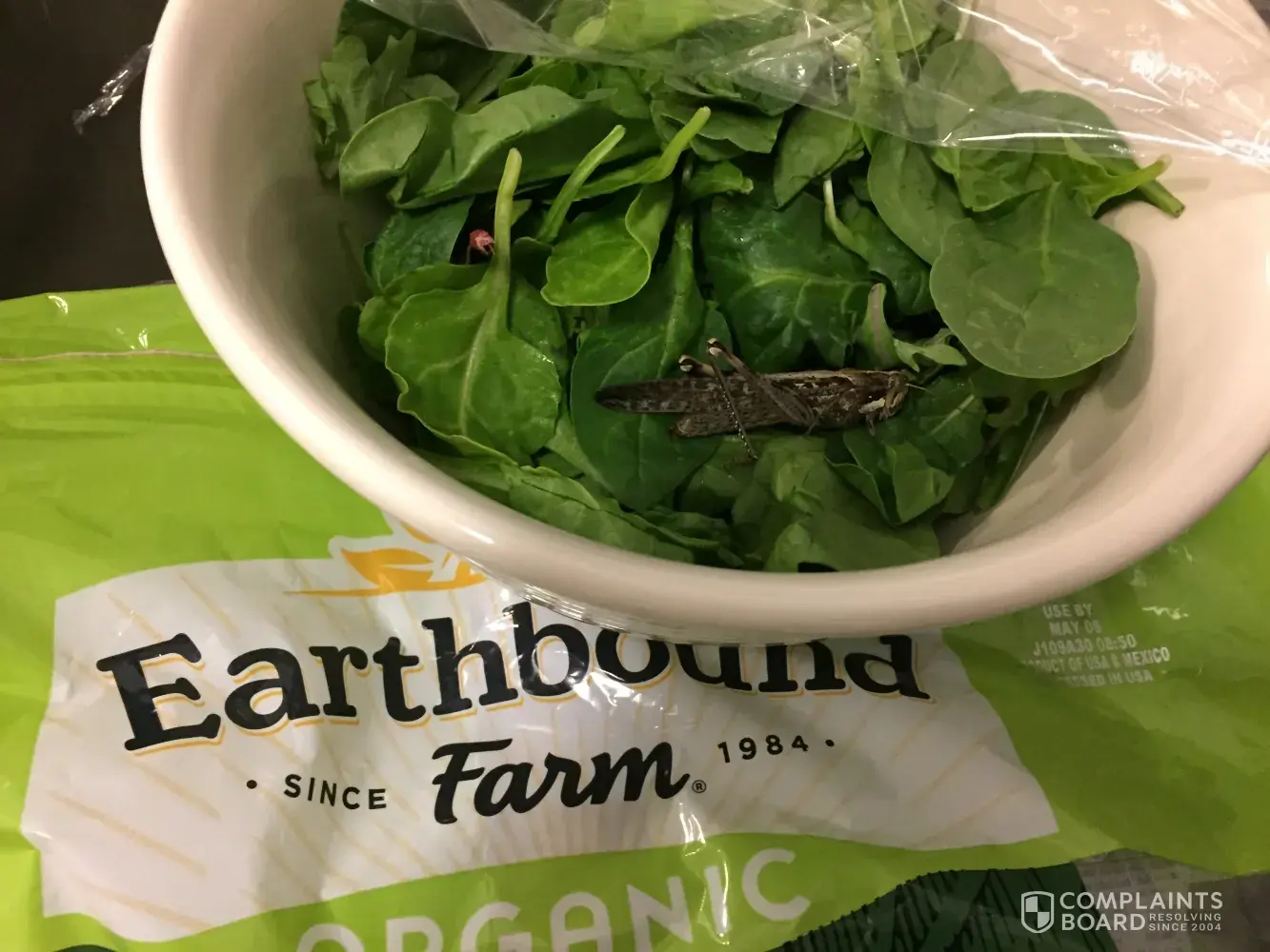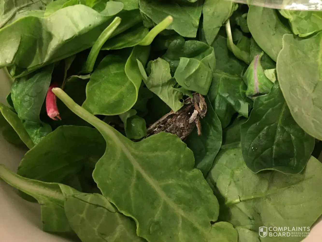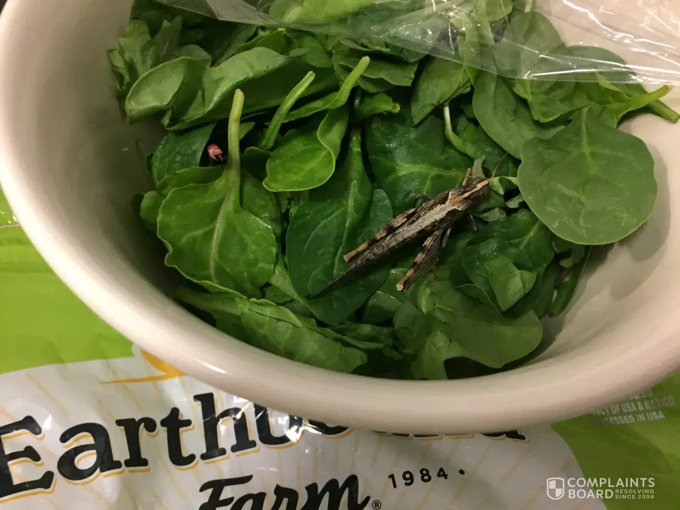 Upon putting the salad into a bowl, we discovered a HUGE grasshopper/cricket. See image attached.