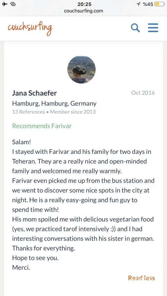 1st . She said "shady and unreliable", "i needed to check if he's not grumpy or not all the time" . She also said "DON'T RECOMMEND THIS PERSON TO ANYONE". I think those words are a kind of defamation, and also against the Terms of Use 4.1.(a), 4.1.(e) on couchsurfing.com.