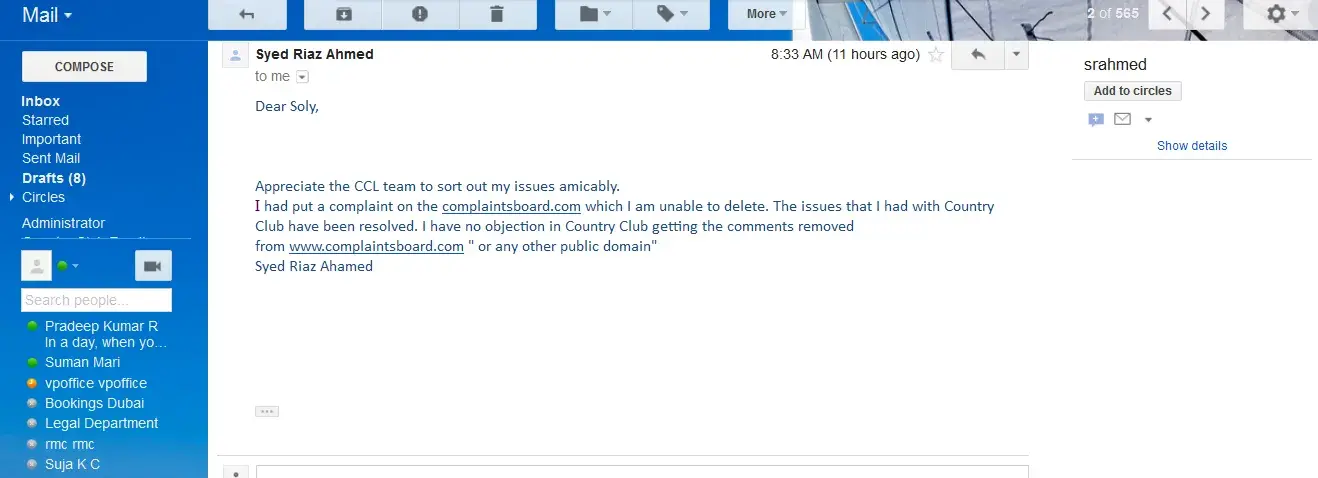 Below is my Last email to country Club dated on 21-03-2018: