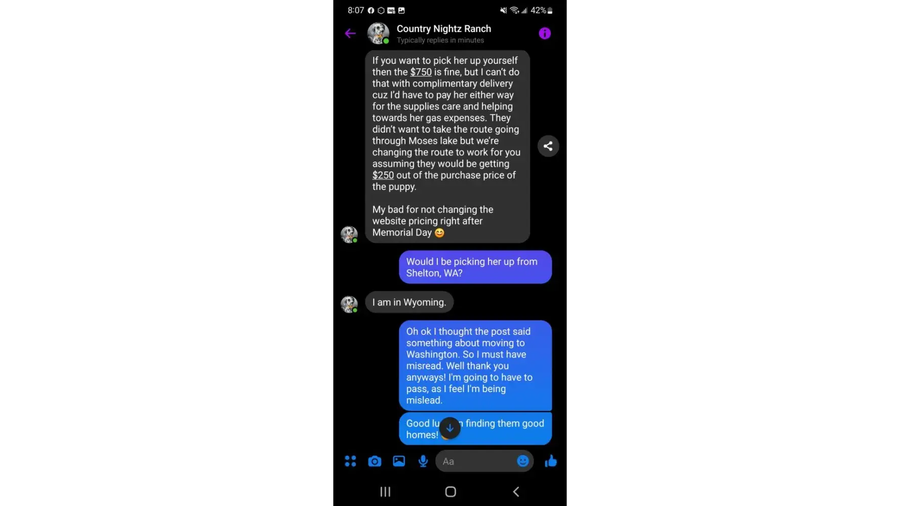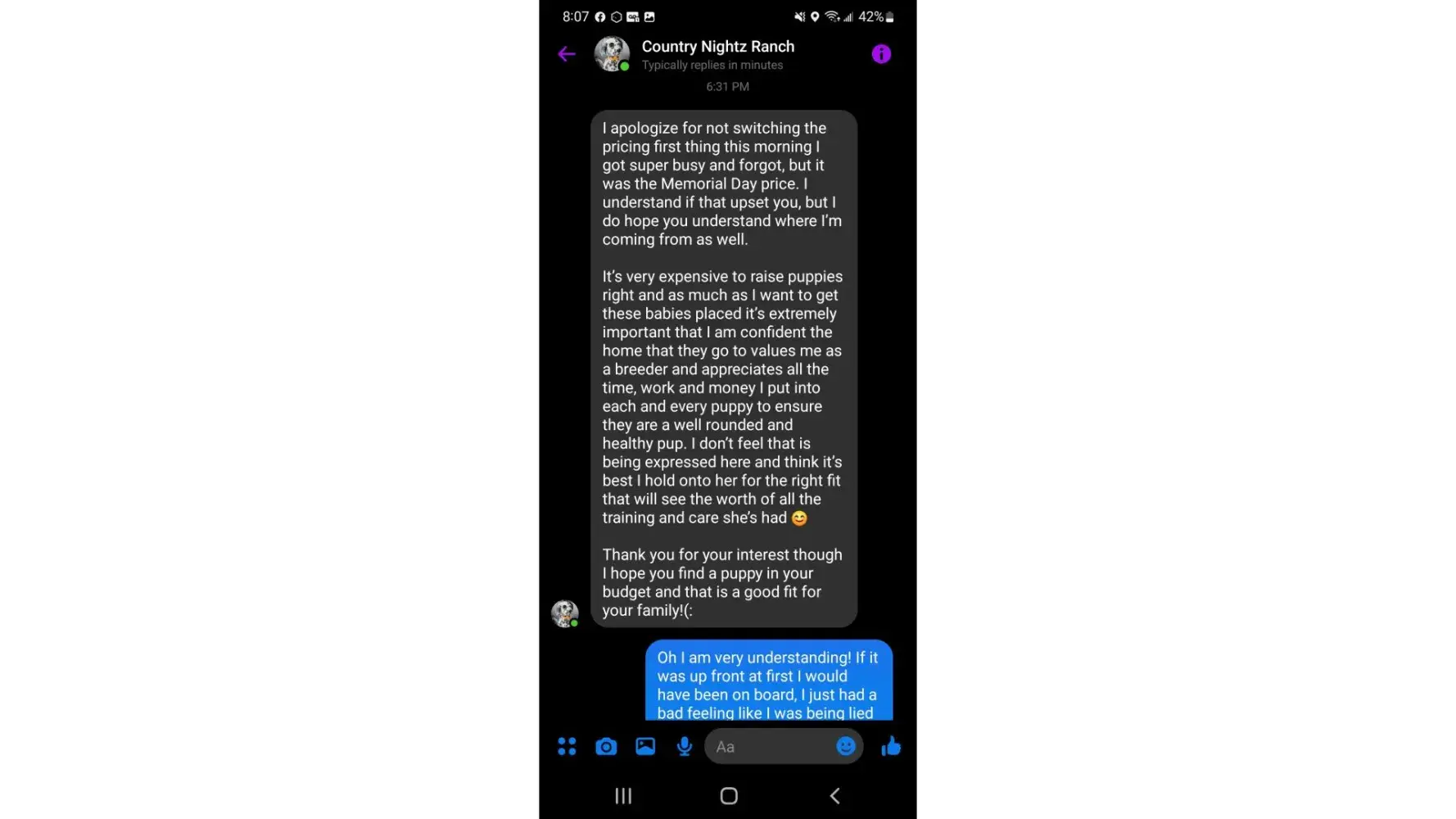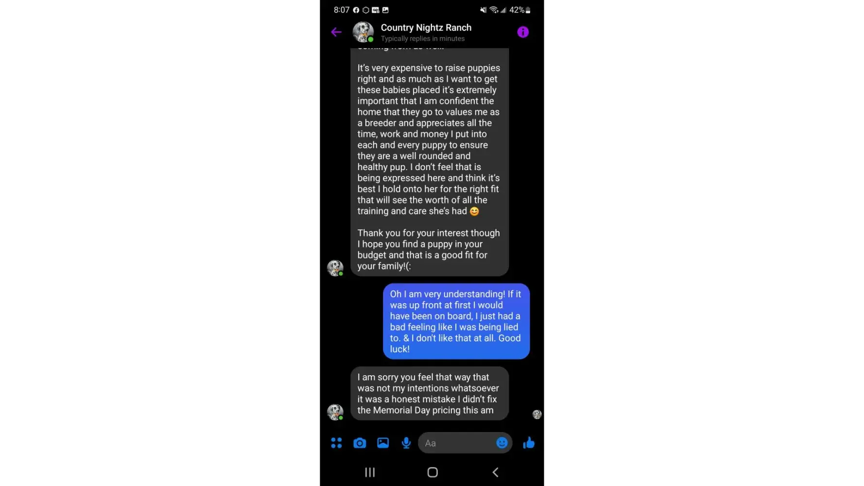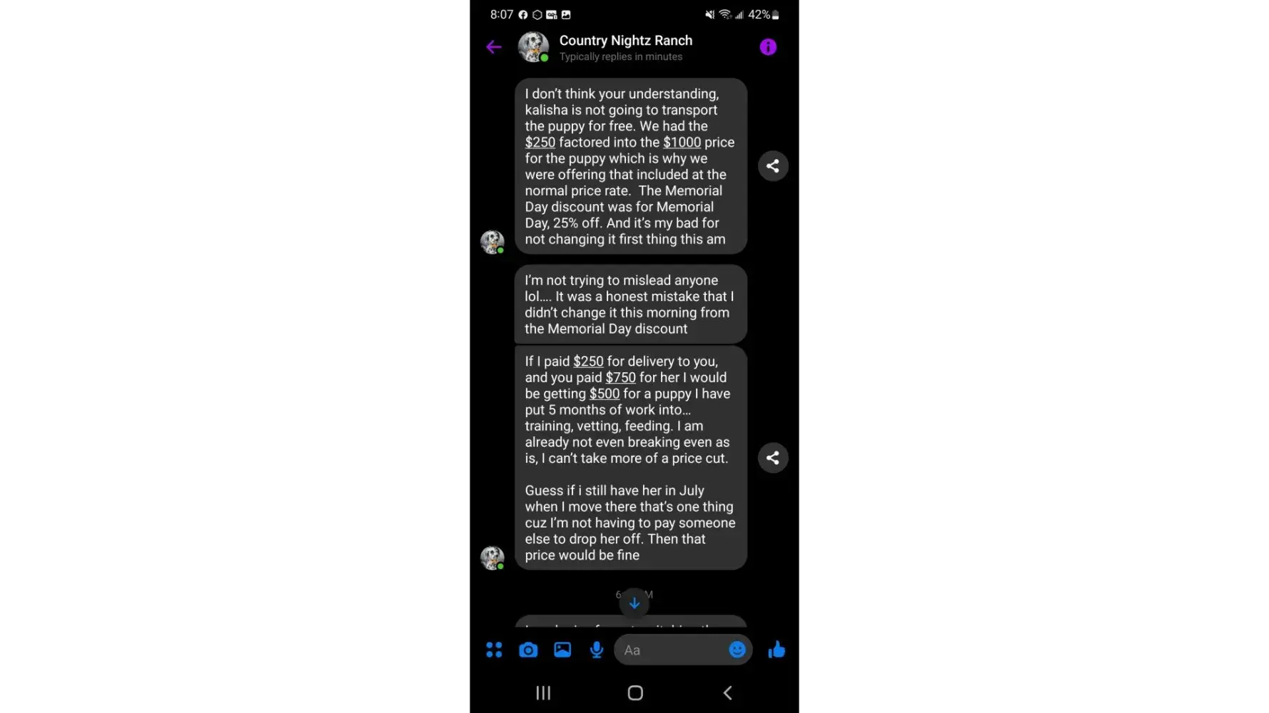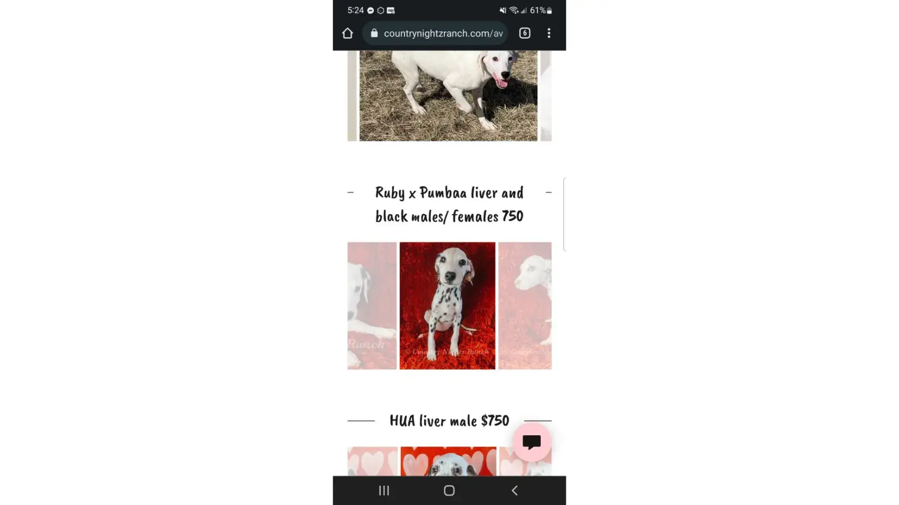 After searching for a Dalmatian puppy I contracted Country Nightz Ranch. It was apparent almost immediately that this was a puppy mill. When I asked about meeting the parents or coming over to pick a puppy (I mean who really wants to have their puppy picked for them) it was a hard no. She told me some sob story about an abusive ex. Well if you can't have people over to your house maybe dog breeding is not for you. She also said she feared parvo being brought onto her property... Well aren't her an her kids just as likely to bring parvo home? Those poor kids are being raised at a puppy mill where dogs and puppies are thought of as stock. She says she loves her dogs. If that were true she wouldn't be constantly selling them off or putting them in "guardian" homes.