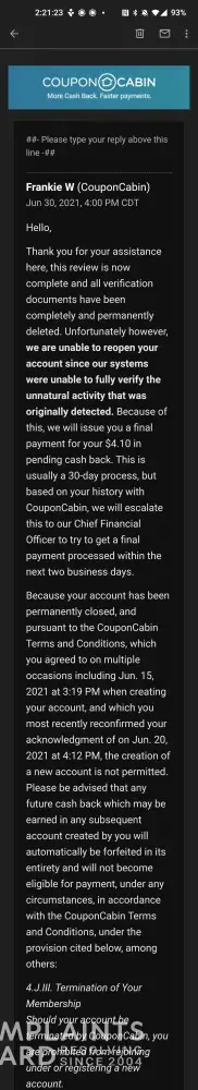 Honestly, this whole thing is a total scam. CouponCabin waits until customers redeem offers or use their links so that they can collect the commission from purchases, and then they turn around and terminate people's accounts and refuse to give them the cash back they earned. It's totally unfair and dishonest.