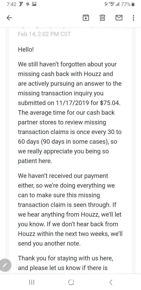11/10/19 I made a purchase thru Coupon cabin, it wasn't my first time, so I made everything right, like always. But after my purchase I didn't get cashback in my account and right after this I made a missing transaction claim. After this every two weeks I got e-mails that they are working on my problem. And I quietly was waiting for their decision. Now I understand that there was no investigation and they just pulled time for three months and now I couldn't make a return to the store after this time.