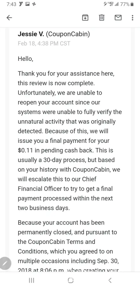 CouponCabin terminated my account on Jan. 16th after I expressed a legal concern regarding their lack of transparency. I had $76.86 pending in my account at that time. Sydney K., the customer service rep who terminated my account, told me that a final check would be processed within 10 days and mailed out to me. It never was.